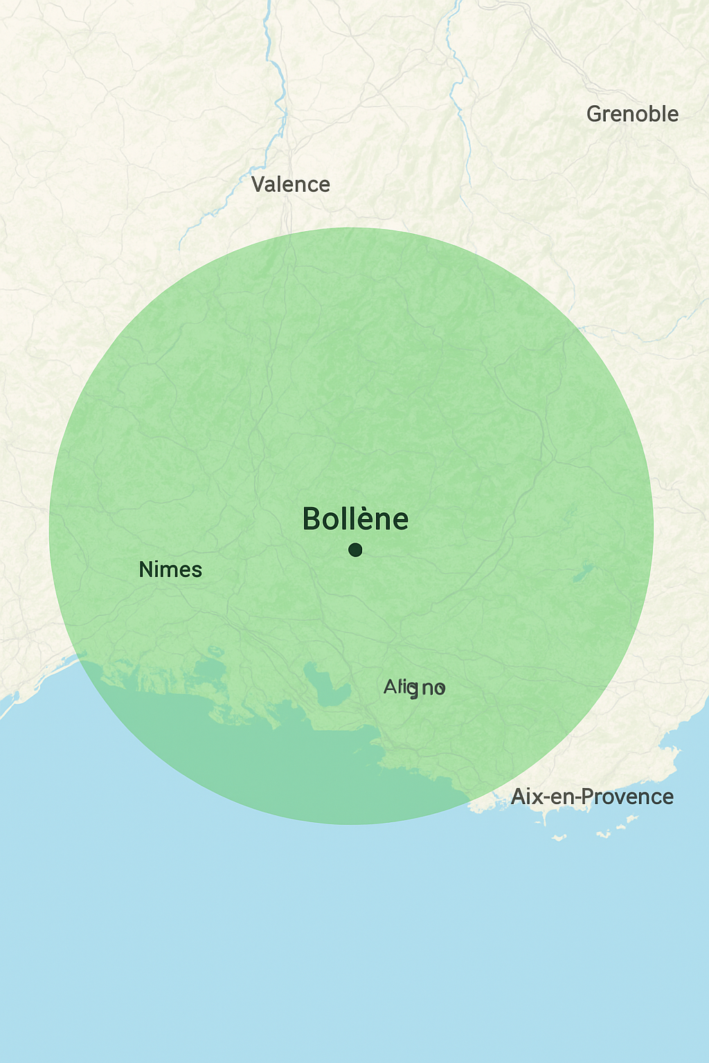 Wij zijn actief in de gehele regio rond Bollène, binnen een straal van 100 km. Of u nu in Avignon, Valence, Nîmes of in de omliggende steden en dorpen bent, ons team staat voor u klaar om uw behoeften met professionaliteit en snelheid te vervullen. Dankzij onze lokale aanwezigheid kunnen wij een snelle en persoonlijke service garanderen, terwijl wij het terrein en de specifieke kenmerken van elk gebied uitstekend kennen.